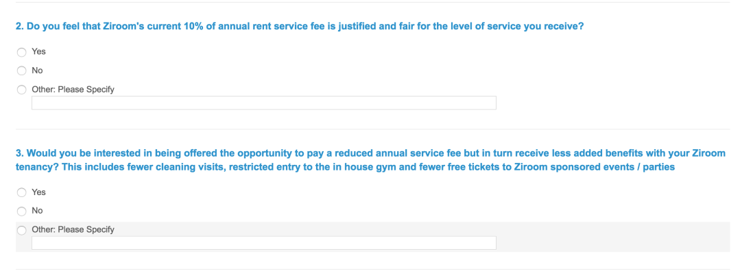 It’s important to consider the price point at which Ziroom Lite is set as Millennials are known to be a money conscious generation (Forbes.com, 2015). To do this, an email survey will be sent out to all current Ziroom tenants containing the questions shown below as well as one regarding what price they believe to be fair for a reduced service fee. This will be a way to gauge the levels of interest as well as have the best chances of it working due to getting the figure from direct customer feedback. 70% of the companies rated best for customer experience regularly use customer feedback to make improvements to their services (Afshar, 2015), thus showing the importance of listening to your customer base.